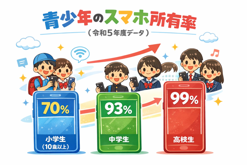 → 高校生になると、ほぼ全員がスマホを所有しています。